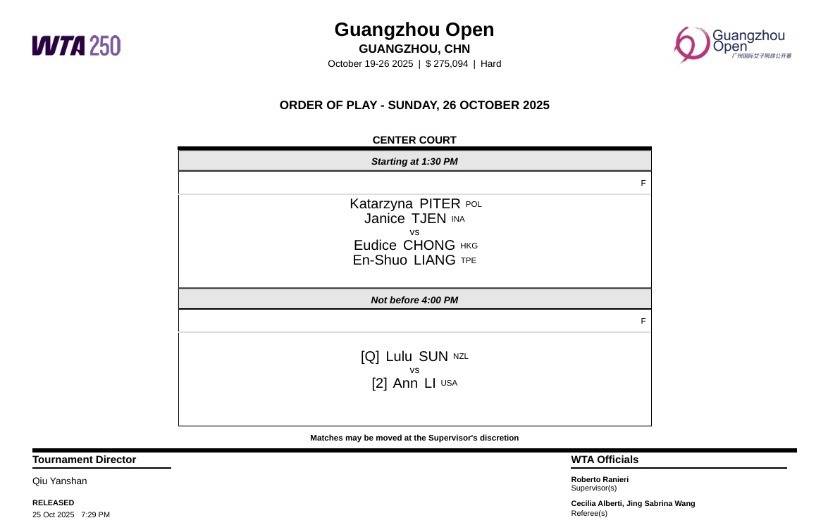 - WTA广州站:张帅无奈因伤退赛安·李孙璐璐明日争冠WTA巡回赛2025赛程__女